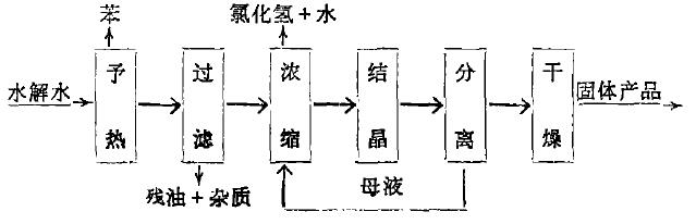 工藝說(shuō)明:水解水首先予熱至沸騰。然后,將予熱后溶液過(guò)濾(采用真空過(guò)濾)除去溶液中殘油及其它雜質(zhì)。過(guò)濾后溶液濃縮至溶液表面有晶膜出現(xiàn)便停止加熱(濃縮終點(diǎn)溫度為124℃,粗測(cè)),使共自然結(jié)晶。將結(jié)晶體與母液分離(離心分離或真空抽濾),母液送回再次濃縮,固體包裝后即為結(jié)晶三氯化鋁產(chǎn)品?;?qū)饪s結(jié)晶后的固體產(chǎn)品經(jīng)與液液分離后,通入熱風(fēng)進(jìn)行干燥處理,包裝后即為產(chǎn)品。