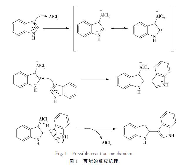 2.2 反應機理討論 筆者結合相關文獻及實驗結果,提出了可能的反應機理:首先三氯化鋁活化吲哚的C-3位,生成亞胺 離子中間體,使吲哚的C-2位顯正電性;接下來另一分子吲哚C-3位的碳原子進攻這個正電中心[17], 實現偶聯;偶聯中間體發生質子轉移[并失去三氯化鋁形成最終產物,離去的三氯化鋁繼續催化反應 (圖1)。